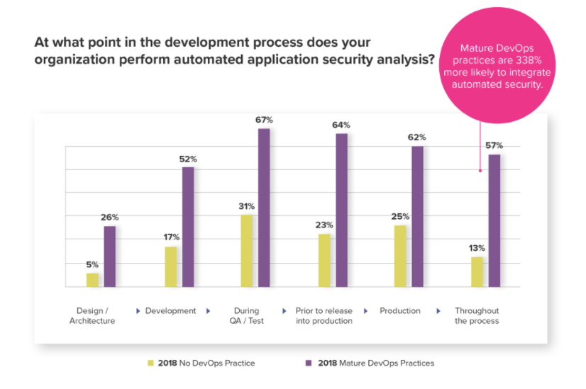 아래 그림은 현재 마지막으로 조사된 DevSecOps에게 2018년도 조사한 내용으로 DevSecOps가 있는 조직과 없는 조직의 어플리케이션 보안성 검사에 대해 비교해 놓은 부분이다. 한눈으로 보아도 각 단계별로 DevSecOps가 없는 조직과 있는 조직의 보안 수준에 대해 상당한 차이가 있음을 알 수 있다.