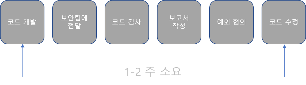 위 상황을 보면, 개발 코드를 받아서 보안팀에서 소비해야 하는 부분들중 코드 검사도 크지만, 보고서 작성과 예외 협의등에서 상당한 시간이 필요하게 된다.
