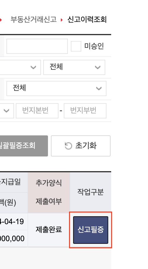 해당 신고 내용을 클릭하면 거래 정보로 필증번호화 승인일자(잔금일)등이 기록되어 있는 것을 알 수 있다.