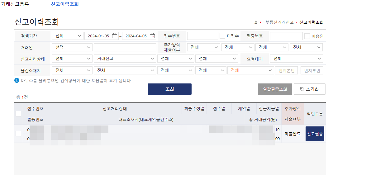 로그인을 하고서 부동산 거래 신고 이력조회를 누르면, 자신하고 관련된 신교이력이 나타나게 된다.