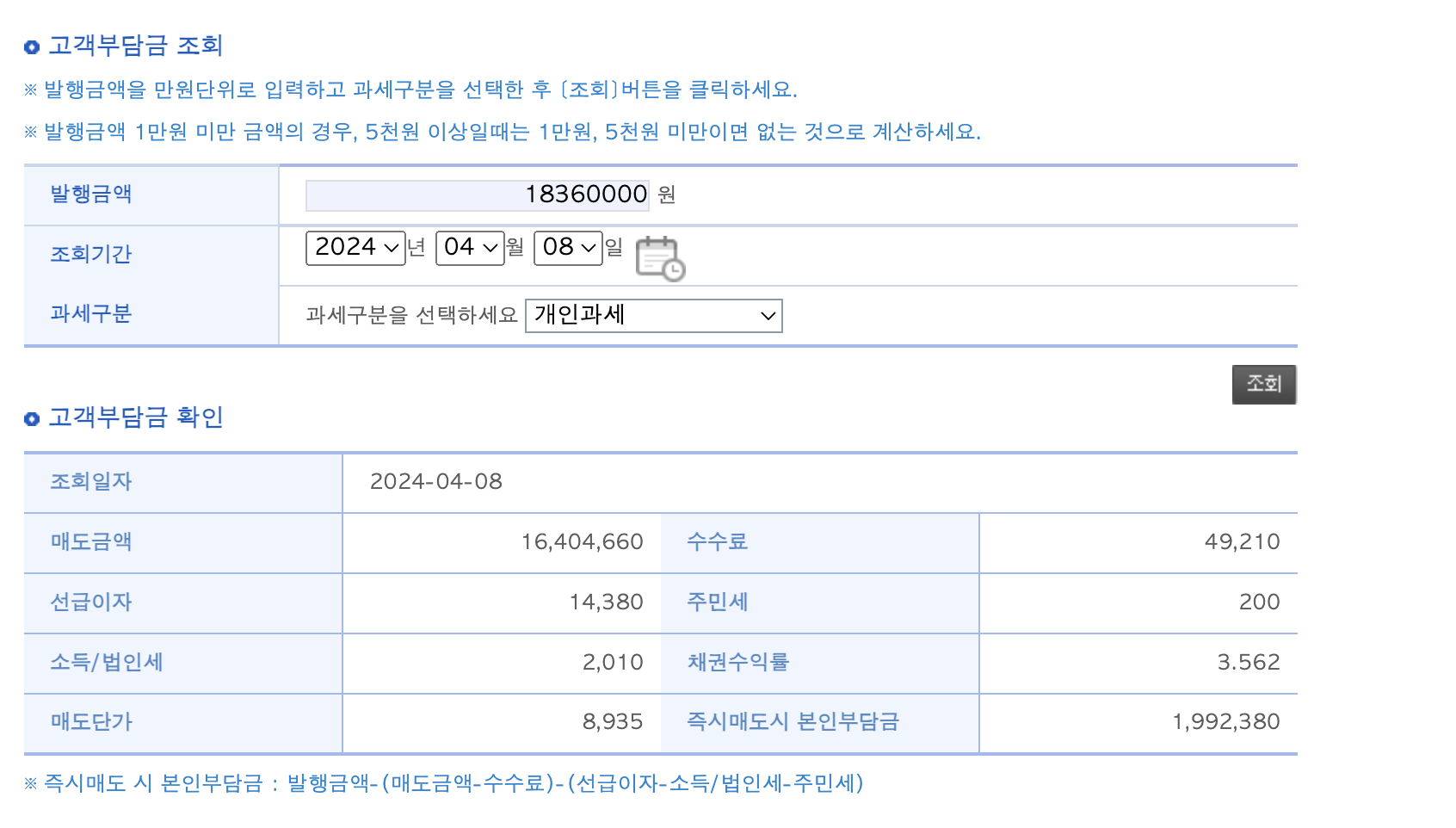 조회를 진행하면 바로 아래에 채권 매입 금액이 나오는데, 이를 통해 고객 부담금 조회를 해야 하기 때문에 또 메모를 해두도록 하자.