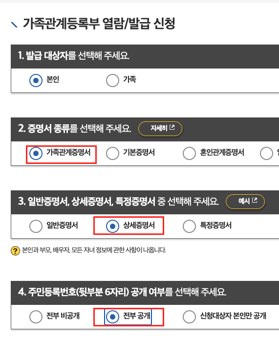 가족관계 증명서는 옵션이 많은 편으로써, 2가지만 기억하면 된다. 주민등록번호 공개, 그리고 상세