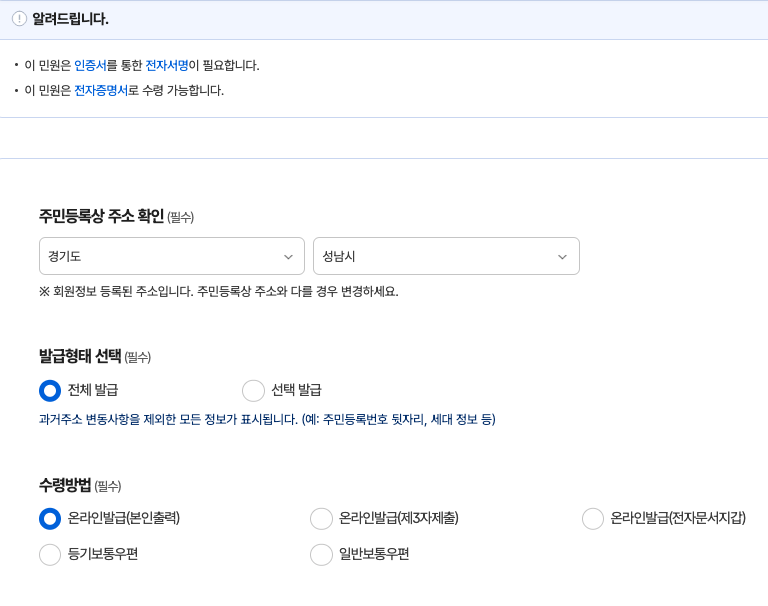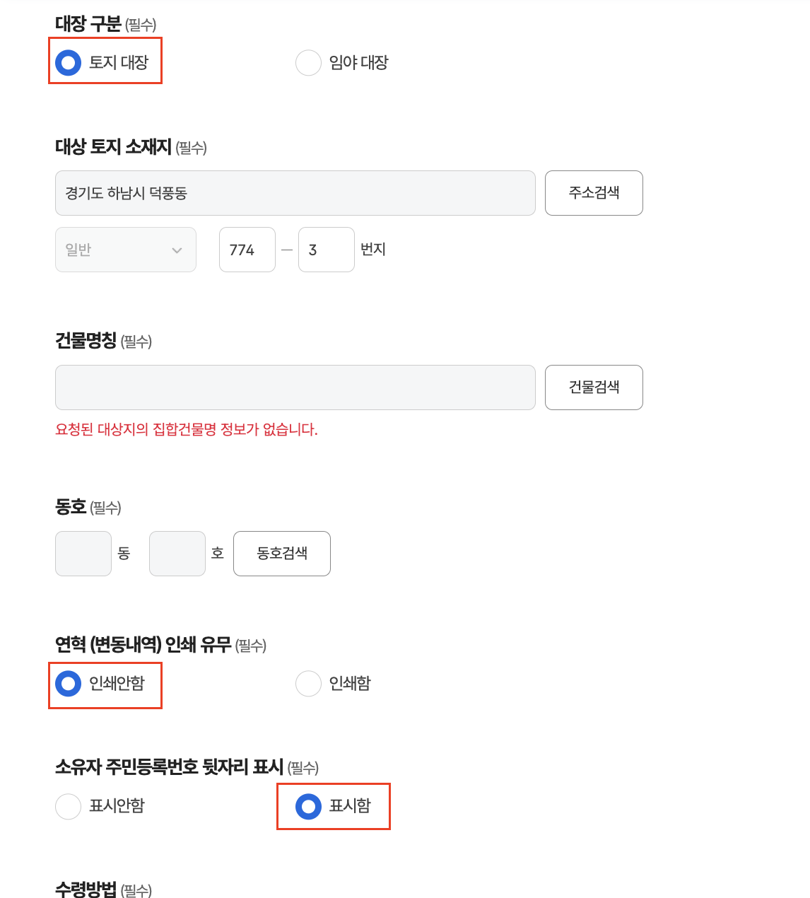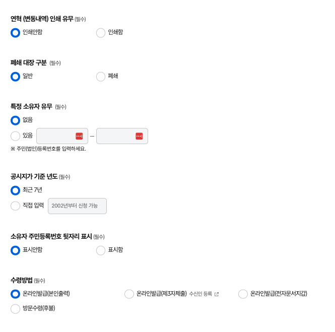 단독주택인 토지(임야)대장등본는 대장 구분: 토지대장 이후 아래와 같이 기본값으로 진행하면 된다.