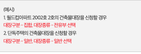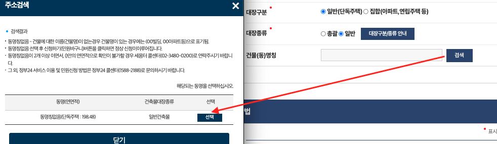 신청을 누르면 본인 인증후에 건물의 세부 소재지 정보를 정확하게 입력하여, 찾고자 하는 건축물을 검색하게 되다. 여기에서 유형을 구분히야하는데, 아파트와 같은 집합 건물은 전유부를 선택하고 그외(단독)에는 일반을 선택하면 된다. 필자는 단독주택이라 일반을 선택했다. 그리고 검색 버튼을 눌려 확인할 건물을 선택하고 신청하기를 누르면 끝이다.