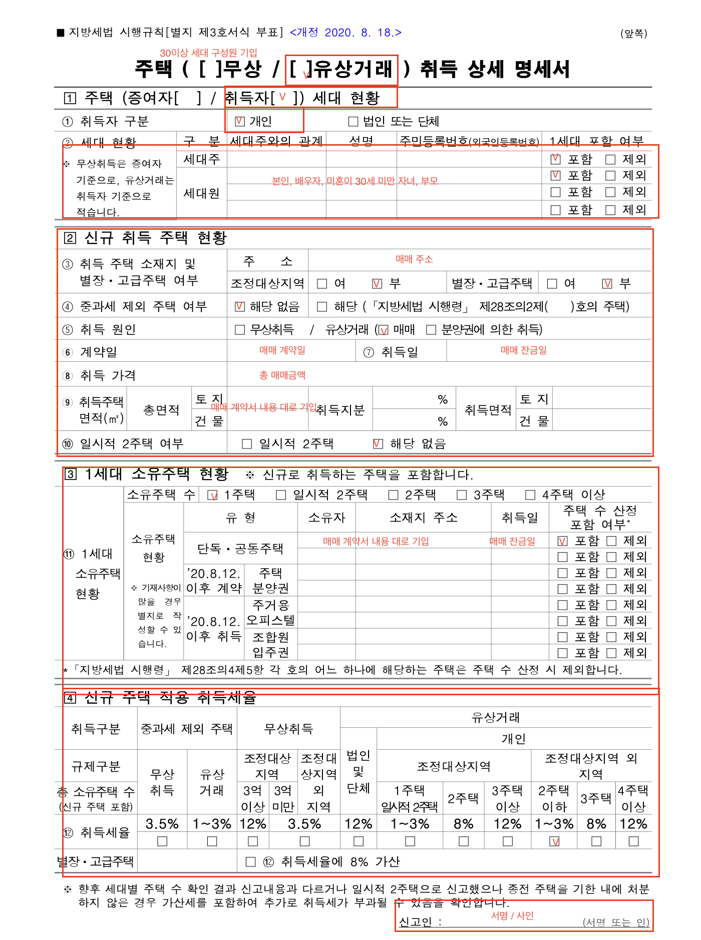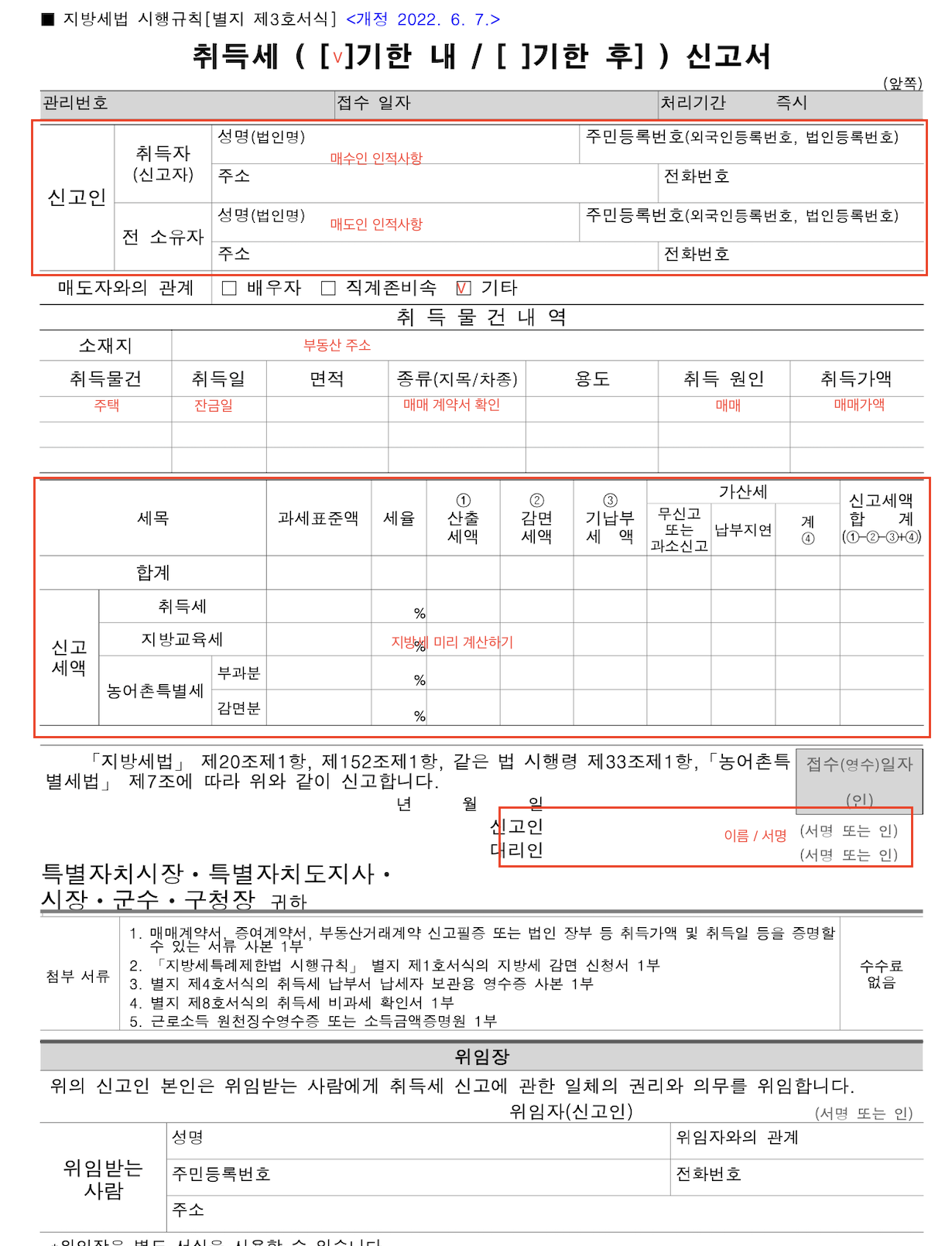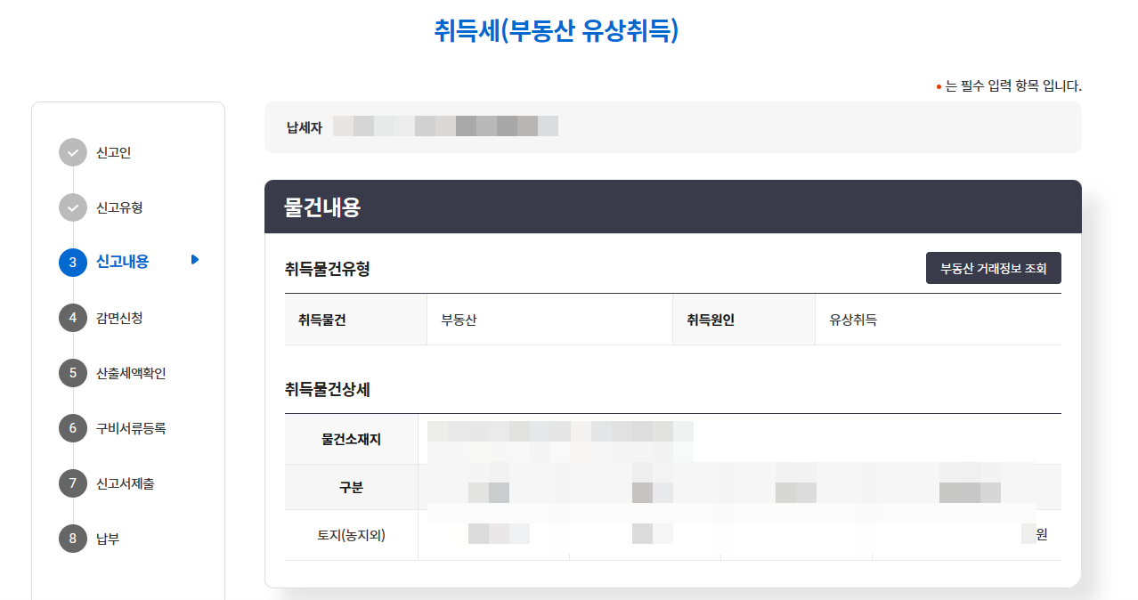 그럼 먼저 취득세 신고서를 작성해보자. 대략적인 기입정보는 아래와 같다.