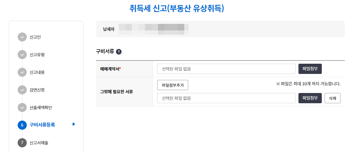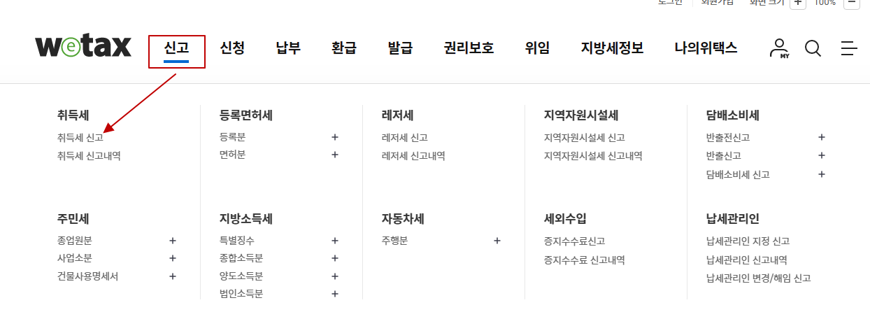 상단의 신고 메뉴에서 취득세 신고 를 통해 가능하다.