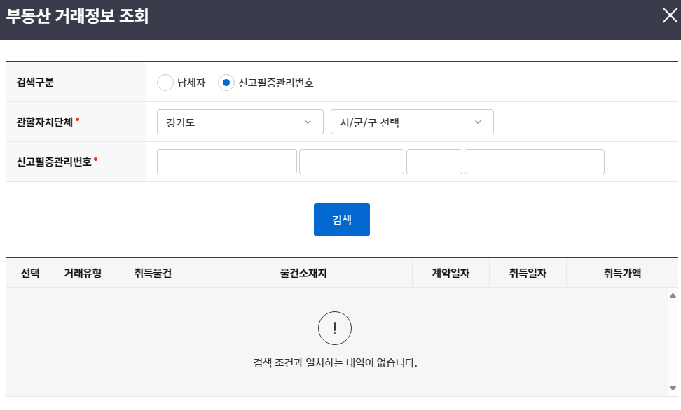 셀프 등기를 위해서는 취득세를 납부해야 하는데 이때 신고필증일렬번호를 알고 있어야 한다. 만약 현재 모르는 상태라면 아래 부동산 거래관리시스템 웹사이트에서 확인이 가능하다. 부동산