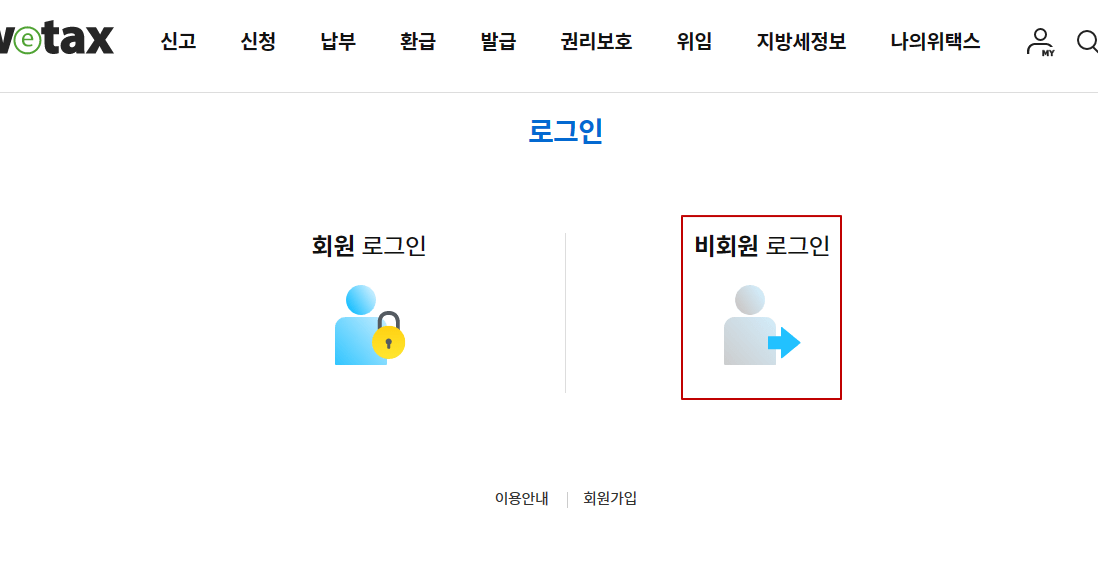작성을 하기위해서는 먼저 로그인을 진행해야 한다. 비회원 로그인을 통해서 금융인증서(은행 발급), 혹은 간편 인증를 이용하도록 하자. 본인에게 가능한 방법으로 로그인을 진행하자.