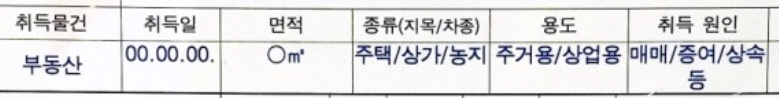취득물건내역은 아래와 같이 예시가 있으므로 아래 내용을 참고하여 적자.