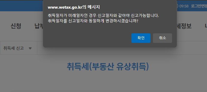만약 미리 입력을 하는 경우라면, 신고일자와 동일해야 한다. 즉 신고일자에 신고가 가능하다 따라서 잔금일자(실제 취득을 하는 계약일)와 맞춰야 하기 때문에, 이부분을 주의해야 한다. 먼저 진행할 경우 세금등이 달라질 수 있기 때문에 실제 계약일에 진행하도록 하자.