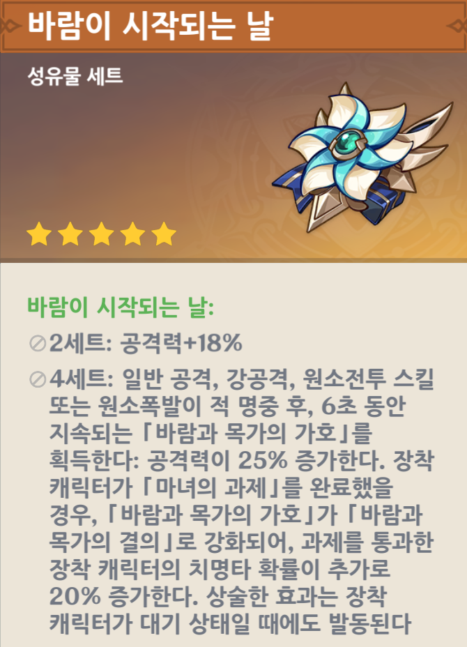 푸리나 파티라면, 그림자 사냥꾼을 생각할 수도 있지만, 바람이 시작되는 날의 성유물을 보면, 마녀의 과제를 획득했을 경우라는 조건이 붙어 있지만, 거희 상시 발동으로 공격력 43%에 치명타 확률 20%라는 엄청난 능력치를 제공하기에, 무조건 이 성유물을 껴야 한다. 그외에는 필요 없다. 이 성유물은 바르카 이외에 마녀회 캐릭터들도 유용하므로, 몬드 캐릭터들도 육성한다는 마음으로 파밍을 해보도록 하자.