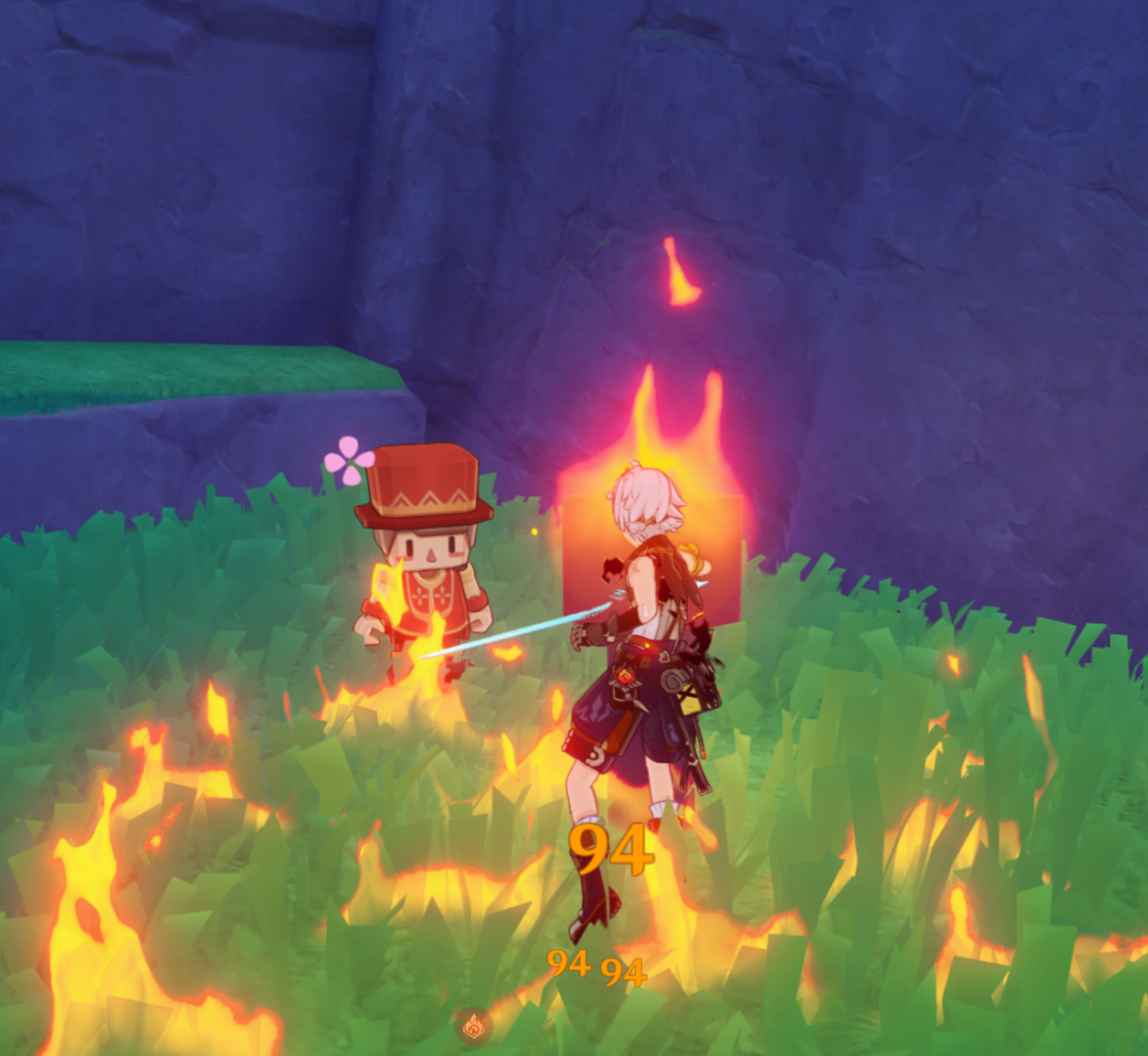 붉은 블럭을 앞에 설치한후 불 원소 캐릭터로 불 원소 반응을 일으키면, 블럭이 까만게 변하게 되고 이를 설치하면 된다.