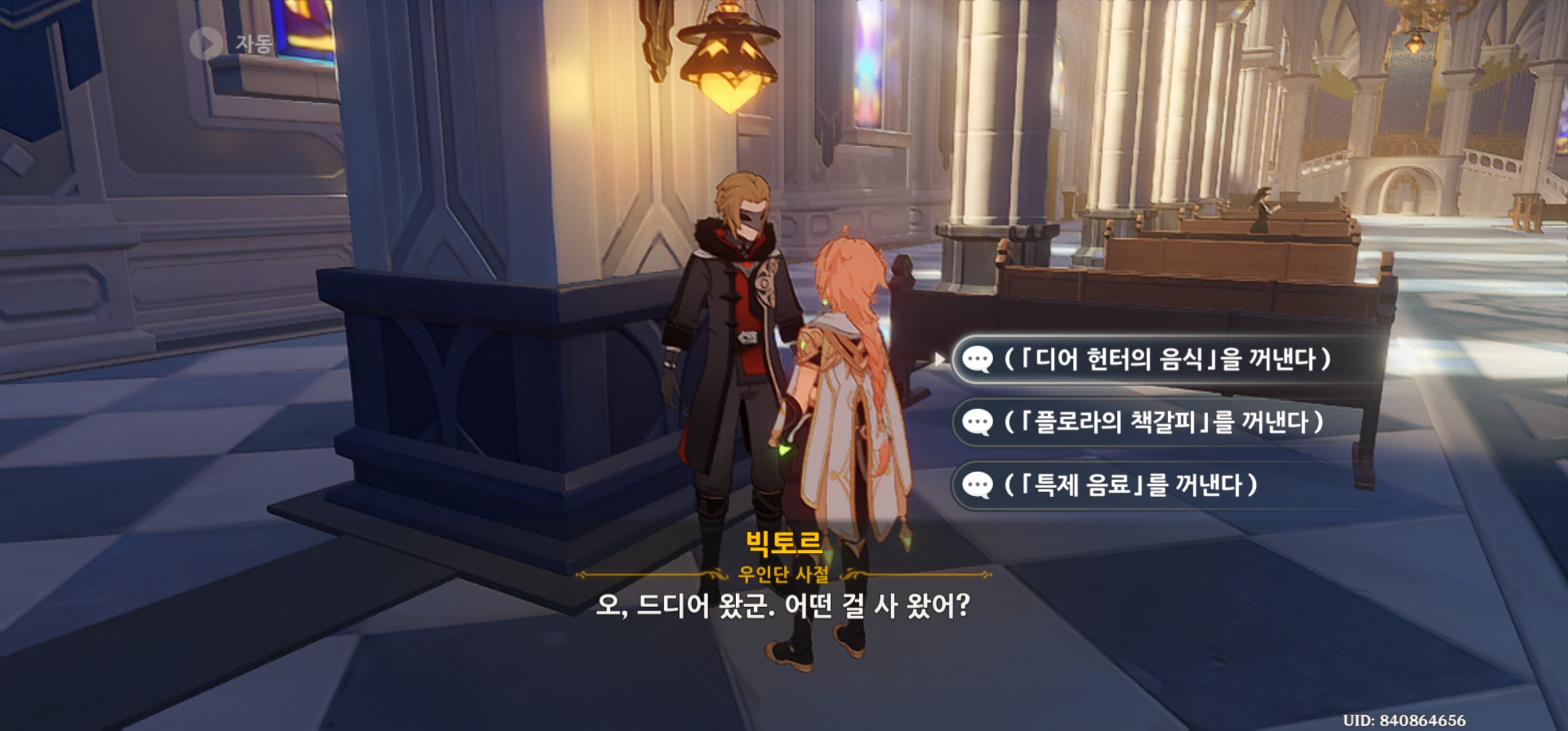 만족 셀러드, 플로라의 책갈치, 특제 음식까지 만들어서 빅토르에게 가면 임무를 완료할 수 있다.