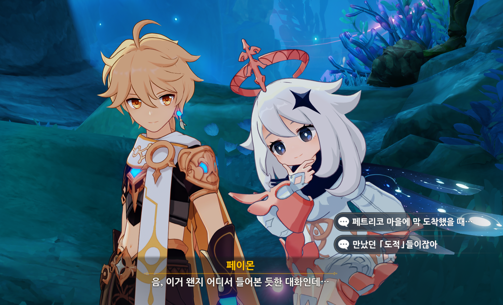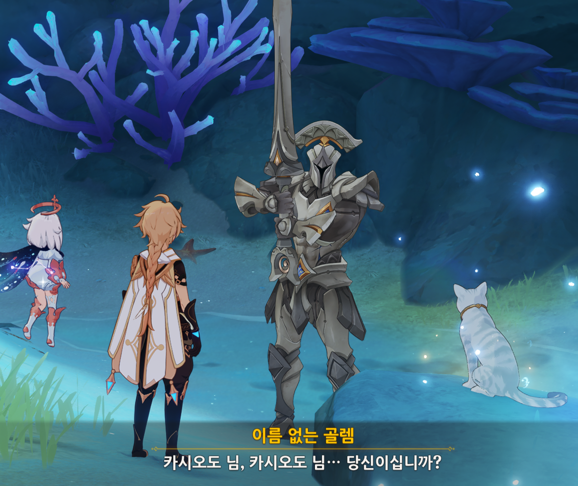 우스가 자세한 경위를 설명해주는데, 섬에 있는 에스테는 자신과 함께 빠져나와 폰타인으로 합류해 평범하게 살고 있는 에스테이고 골렘은 과거의 에스테 조상이라고 한다. 그리고 나머지 골렘은 존엄자를 거역하고 약탈을 하면서 범죄를 저지리고 있는 상황(즉 과거의 잘못을 보여주고 있다.)