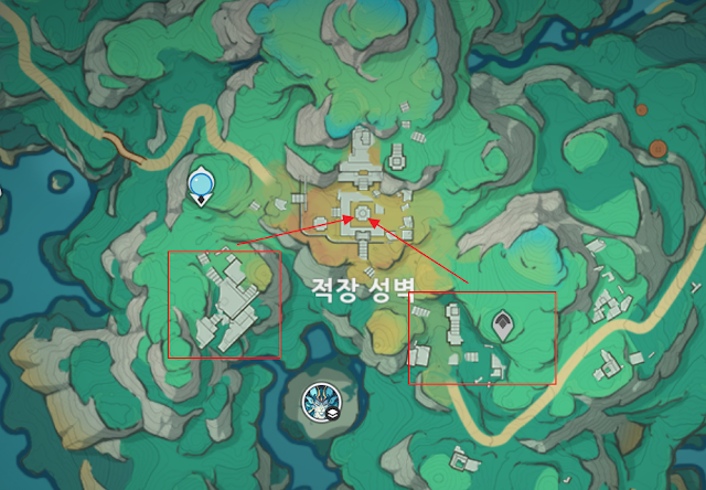 적장 성벽 기준으로 왼쪽에 위치해 있다. 아래 3개의 기둥을 찾아서 설치하면 되는데, 지도 기준으로 아래와 같이 위치해 있다.