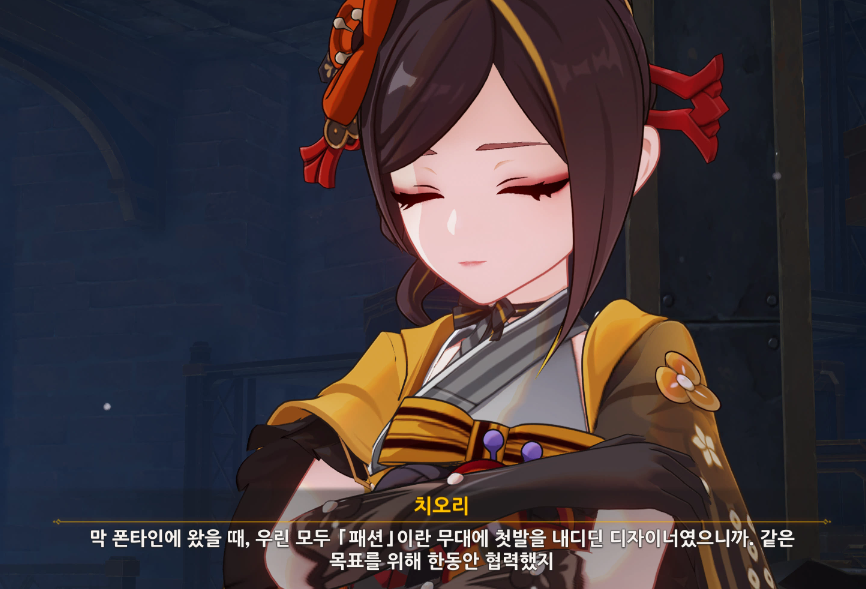 우서와 한바탕 한 후에 다시 패션위크 준비를 진행하는 치오리... 여행자에게 옷 진열을 맡기는데, 아무렇게 해도 진행이 되기 때문에 큰게 신경쓸 필요없이 편하게 진열하자.