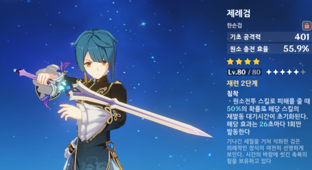 현재 물의 환영으로만 제례검 효과가 발동하기 때문에 손해를 볼 수 있는 가능성도 높다. 따라서 더 공격적인 무기를 선택하고, 원소 전투 스킬 쿨타임이 12초이기 때문에 빈 시간을 채워줄 메인딜러를 1명 더 고용하는 파티가 효율성이 있지 않을까 싶다. (개인적인 생각은 라이덴인데, 라이덴의 원소 전투 스킬도 0.9초마다 저 타격에 맞춰서 터지는걸 생각하니... 짜릿하다)