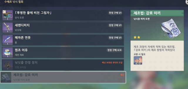 수량도 2, 3일 정도만 낚시터를 돌아다녀도 충분히 획득이 가능하다. 이후 강화재료도 동일하기 때문에 어렵지 않게 획득이 가능할 것이다.