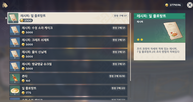 폰타인 마을 상점 NPC 별 판매 아이템/레시피 판매 곳 정리