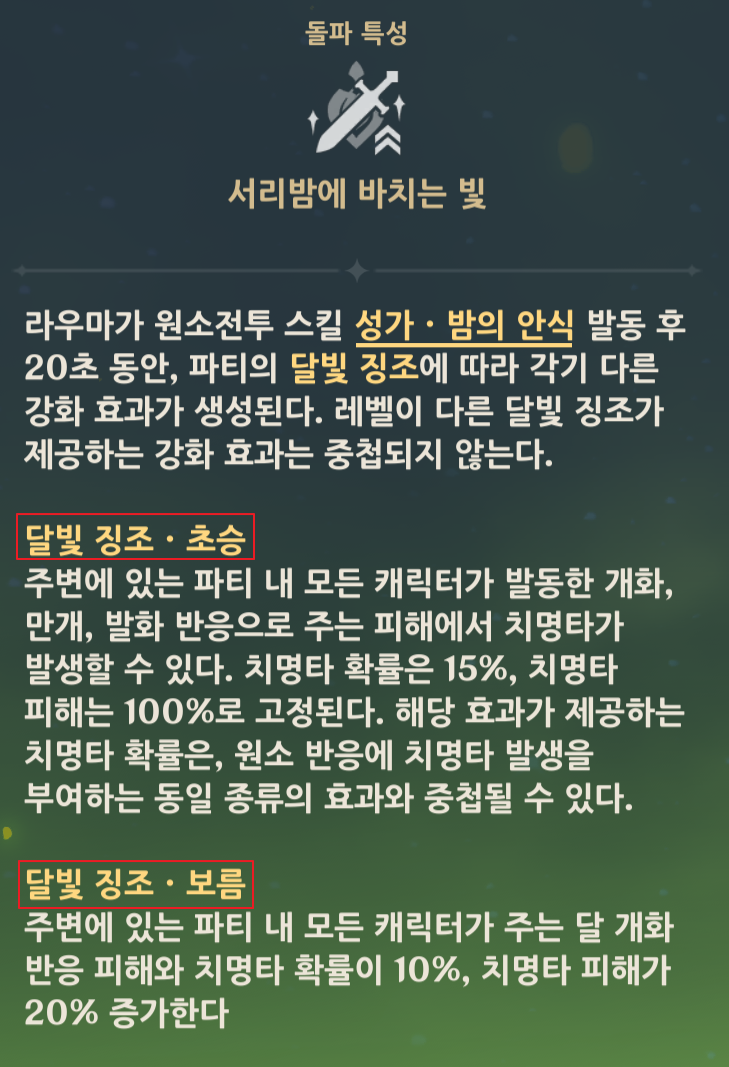 - 고유 특성으로 월개화 반응 시 팀의 치명타율·치명타 피해 증가 및 HP 회복 지원.