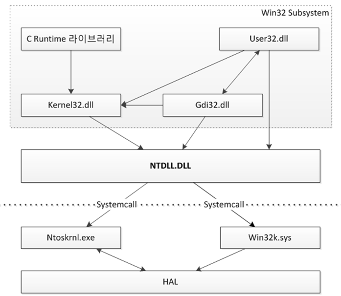 이 둘간의 전달 역할을 해주는 것이 서브시스템과 Ntdll.dll로써, 서브시스템은 바로 우편배달부처럼 각 지역 요청들을 수집하여 우체국에 전달하고 이를 우체국과 유사한 기능을 하는 Ntdll.dll 받아 처리한다. 정리하면 사용자들의 커널 이용을 위한 요청을 우편배달부(서브시스템)가 우체국(Ntdll.dll)을 통해서 커널로 진입 시키는 것이다.
