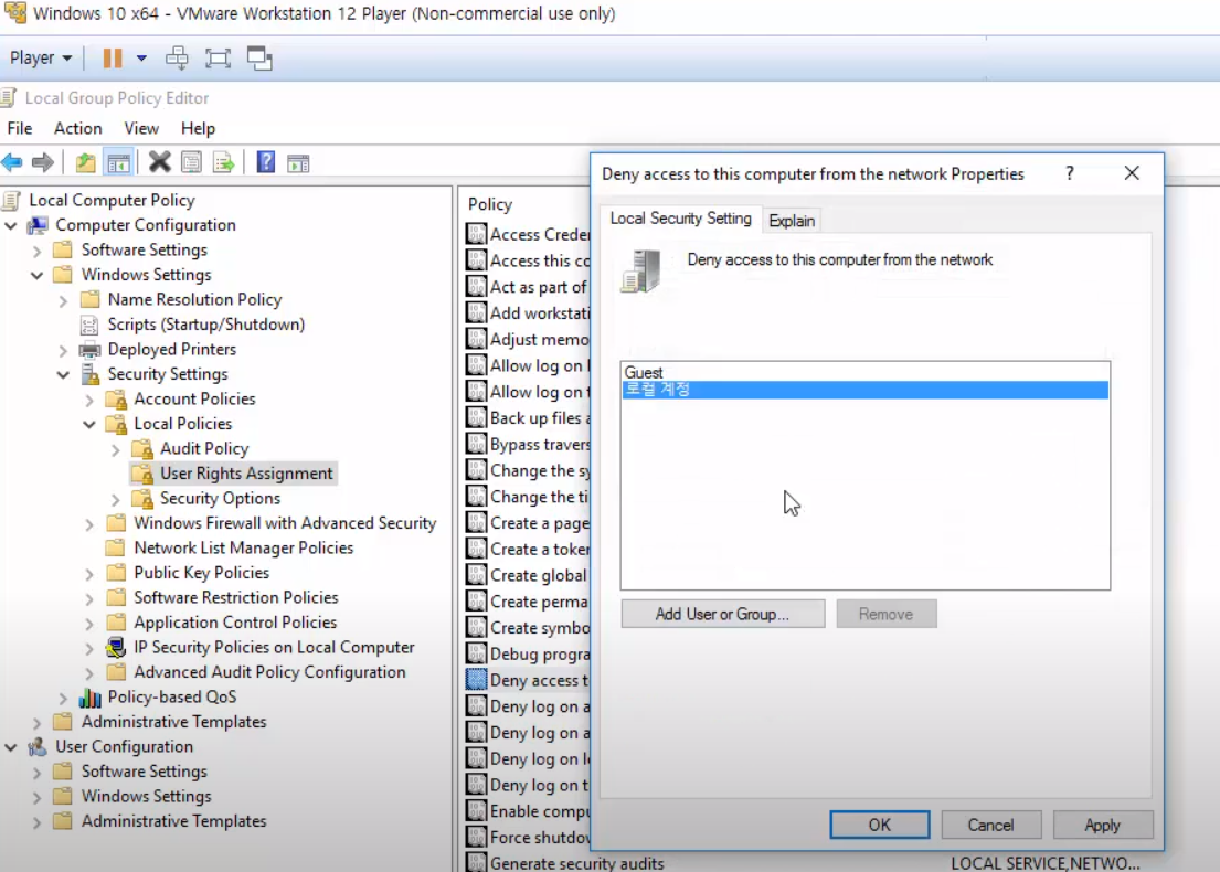 컴퓨터구성 -> Windows 설정 -> 보안설정 -> 사용자 권한 할당 -> 네트워크에서 이 컴퓨터 엑세스 거부