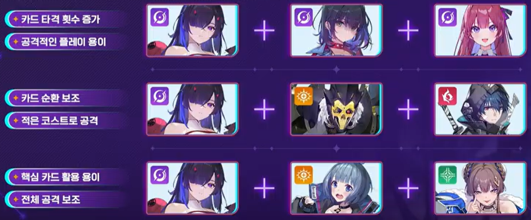 공식 채널에서 추천하는 파티는 공허 3명과 함께가는 파티이다. 특히 트리샤의 0 코스트 카드를 이용해서 많은 공격을 진행하고, 이후 치즈루가 쌓인 중첩을 이용해서 강력한 한방을 때리는 컨셉이라고 할 수 있다. 여기에 공허 서포터 캐릭터 미카를 데려가면 안성 맞춤이다.