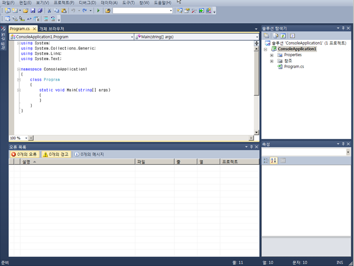 그리고 프로그램을 빌드(F6키)를 하면 상태표시 줄에 빌드하였다는 메시지를 확인할 수 있다(코드 구분이 잘못되면, 오류 목록에 관련 오류가 표시되며, 빌드가 실패된다).