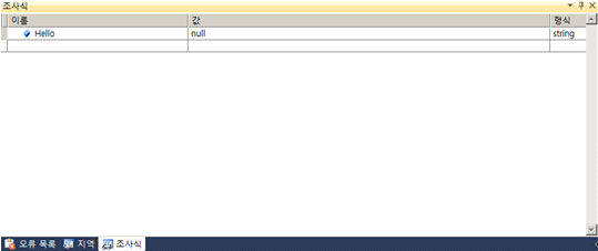 위 그림과 같이 디버깅 중에 처리되는 지역 탭을 통해 자동으로 지역 변수들의 값들을 확인할 수 있다. 지역 탭 옆의 조사식 탭은 조사하고자 하는 변수나 식을 직접 지정하여, 현재 지역변수 이외의 값을 확인하거나, 이를 추적하고자 할 때 유용하다.