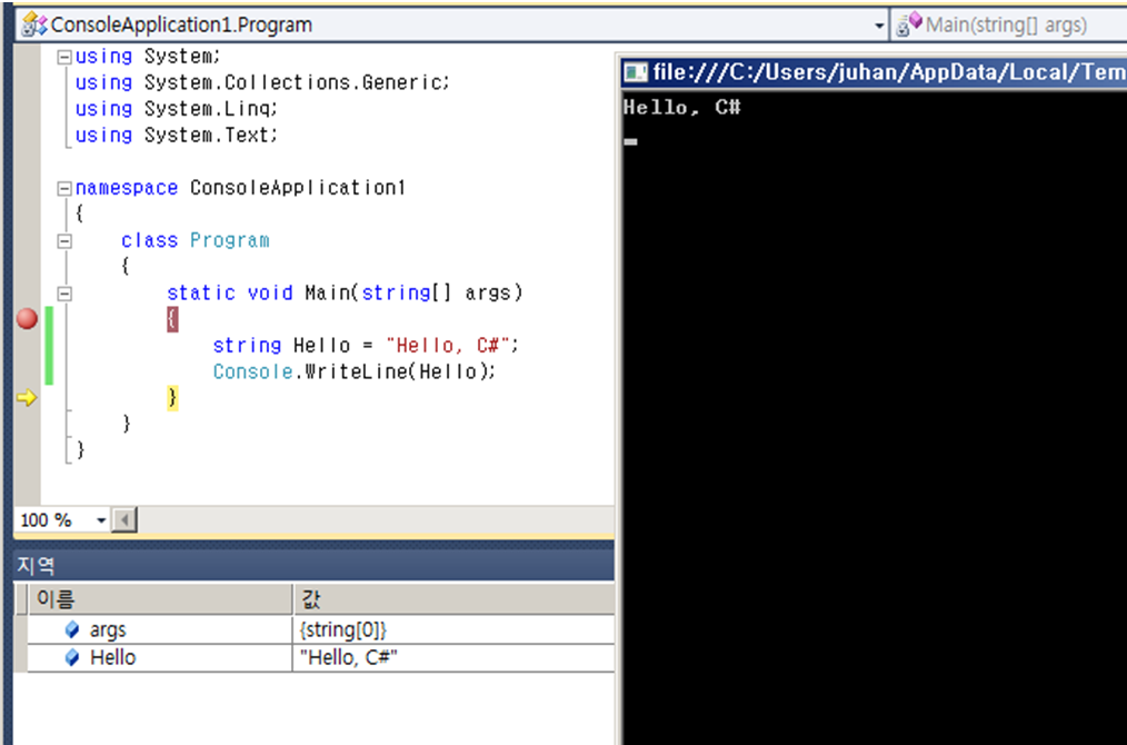 이후 한번 더 한 단계씩 코드를 실행(F11키)을 진행하면, Console.WriteLine(Hello);가 실행되면서, 디버깅중인 프로그램 화면에 Hello, C#이 출력됨을 확인할 수 있다.