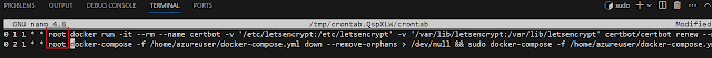 0 2 1 * * root docker-compose -f /home/azureuser/docker-compose.yml down --remove-orphans > /dev/null && sudo docker-compose -f /home/azureuser/docker-compose.yml up -d