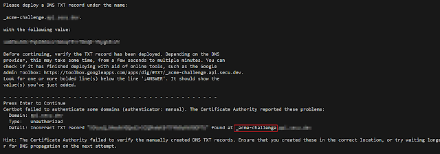 필자는 dns의 레코드로 갱신하는 방법을 선택하여, 아래 _acme-challenge라는 값을 생성하여 모자이크 값을 입력해줘야 정상적으로 인증이 완료된다.