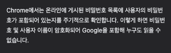 내용을 살펴보면, Chorme에서는 온라인에서 판매, 공개된 사용자의 비밀번호를 확인하여 현재 비밀번호가 동일한지 확인해서 동일한 경우 변경하라는 알림을 내보내게 되는것.