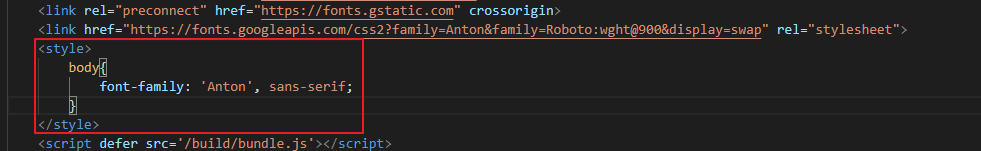 필자가 선택한 Roboto와 Anton중 예제에서는 'Anton'을 선택했다. 'Anton'뒤에 sans-serif를 적어주는 이유는, 만약 폰트 사용이 어려운 경우 대체로 사용할 수 있는 폰트를 지정해줄 수 있는데, sans-serif로 기입을 해주면 사용자가 가지고 있는 폰트중에 고딕체를 우선시하게 된다.