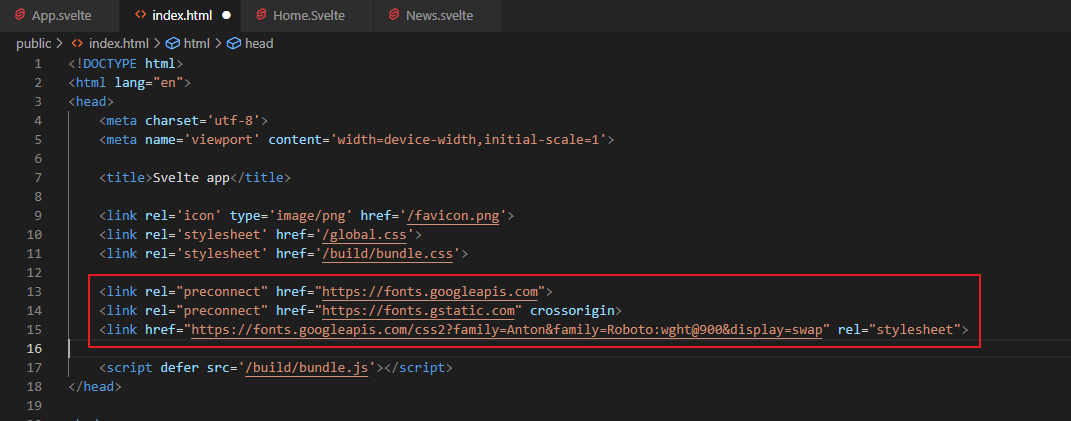 이 코드를 자신이 적용하고자 하는 HTML 페이지에 넣으면 되는데, Svelte 기준으로 /public/index.html에 적용하면 SPA로 작성한 경우 전체 적용이 가능하다. 그외 필요한 HTML 페이지가 있다면 아래와 같이 적용해 주면 된다.