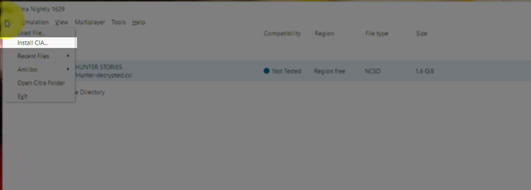 .cia로 활용해야하는 파일은 바로 dlc로 제공되는 설치 파일이다. cci는 potable 로 사용할 수 있기 때문에 추가로 제공되는 dlc는 Citra에 설치해서 사용해야 한다. Citra에서 File-> Install CIA를 통해 DLC 설치가 가능하다.