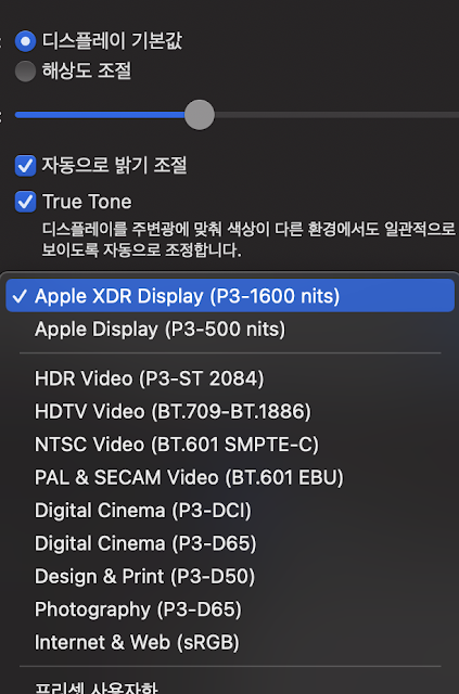 기존에 맥북을 사용하다가 MAC M1으로 교체하면서 모니터 색상이 기존과 다르다는 느낌을 받았다. 환경 설정의 디스플레이로 가보면, MAC M1의 경우 Apple XDR Display로 기본 설정이 되어 있는 것을 알 수 있었다.