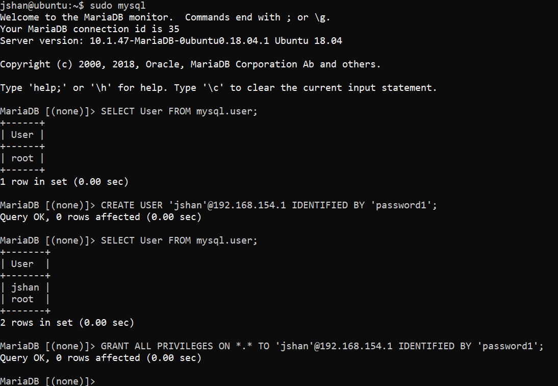 CREATE USER 'jshan'@192.168.154.1 IDENTIFIED BY 'password1';