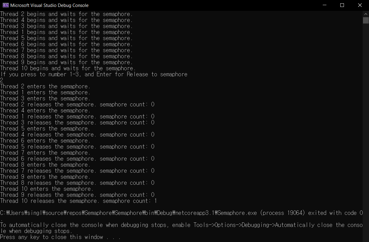 Console.WriteLine("If you press to number 1-3, and Enter for Release to semaphore");