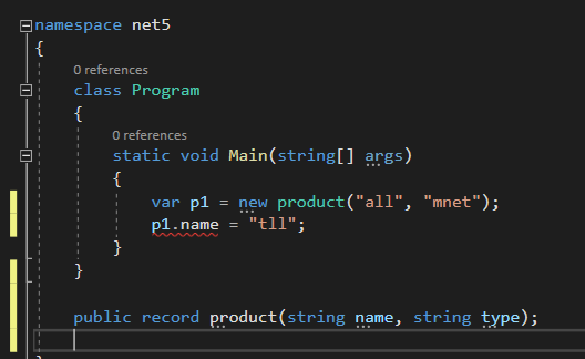 record는 기존 코드의 호환성을 위해 get; set; 역시 선언 할 수 있다. 이는 앞서 record 키워드가 괄호를 사용함으로써 중괄호를 통해 코드 확장성을 유지한 준것으로 보인다.