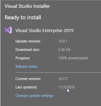 Visual Studio 에서 .Net 5를 사용하기 위해서는 Visual Studio 16.8.0 버전 이성으로 업데이트가 필요하다.