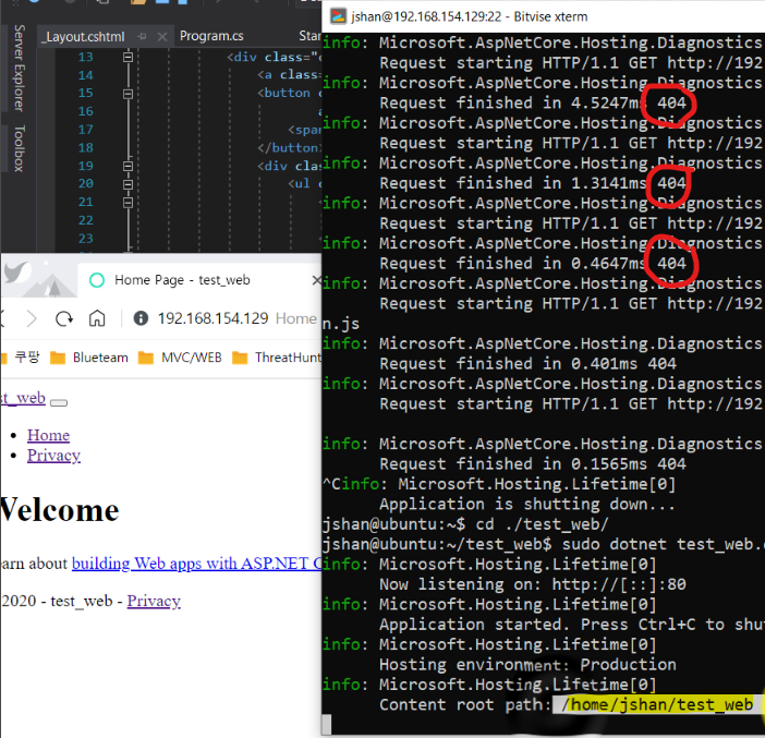 마지막으로 dotnet 실행시 주의할 점은 어플리케이션의 working 디렉토리가 실행 위치로 되기 때문에 배포한 어플리케이션이 아닌 다른 위치에서 실행하게 되면, 파일 위치를 정상적으로 인식하지 못하고 404 에러가 발생하게 된다.