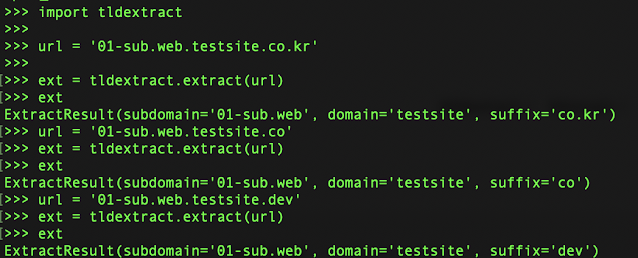 Python을 이용해서 도메인과 서브 도메인을 구분하는 방법은 Regex를 사용할 수도 있지만, .com과 같은 2차 도메인과 .co.kr 3차 도메인의 차이점, 그리고 서브에 서브도메인을 구분하기 위해서는 많은 조건이 필요해지게 된다.
