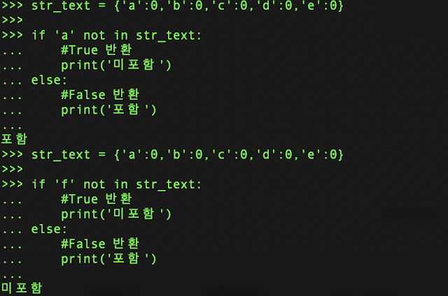 not in은 반대로 포함하지 않는 경우 True를 반환한다.
