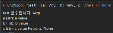 그리고 함수 설명에도 어떤 타입(유형, str, int등 인자값 종류)의 인지 값인지 쉽게 확인이 가능하다.