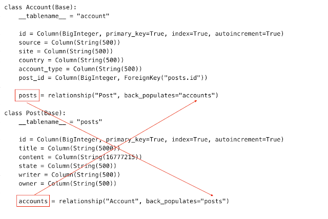 위 테이블 기준으로 아래와 같이 back_populates에 관계되는 컬럼을 적어 주어 서로간에 연결이 되어 있음을 명시해주도록 하자.