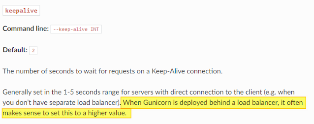Uvicorn/Gunicorn 역시 기본값은 Uvicorn은 keep-alive에 대해 5초로 구성 되어 있고, Gunicorn은 30초라고 하니 이를 보다 여유있게 늘리는 것을 추천한다. 특히 Uvicorn은 keep-alive 를 기본적으로 지원하기 때문에, 이 구성을 늘리는 것을 추천한다.