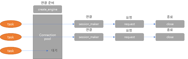 앞서 그림에서 보았듯이 create_engine시 연결 갯수와 대기 갯수를 지정할 수 있다.