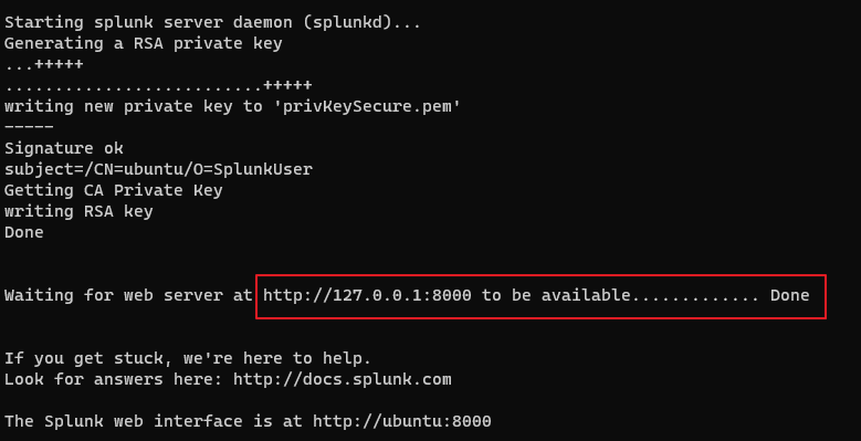 만약 splunk start를 하였다면 아래와 같이 서비스를 구동하는 작업을 진행하고 아래와 같이 접근 가능한 포트와 주소 정보를 통해 서비스가 정상적으로 실행되었다는것을 알게된다.