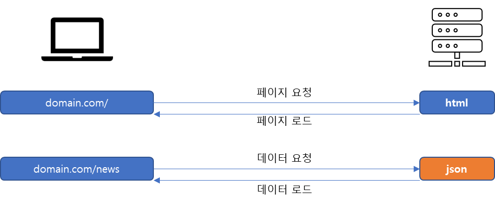 따라서 웹 화면 구성등 기존 이미지들은 유지되고, 서버에 변경에 필요한 데이터만 요청하기 때문에 상당이 부담이 덜 할 수 있다.